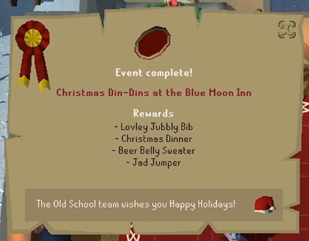 After delivering Jobless Jim’s meal, sit down at the last remaining empty table. The chef will bring out your own Christmas dinner as a reward for your hard work. After the cut scene, congratulations, the 2025 OSRS Christmas Event is now complete!