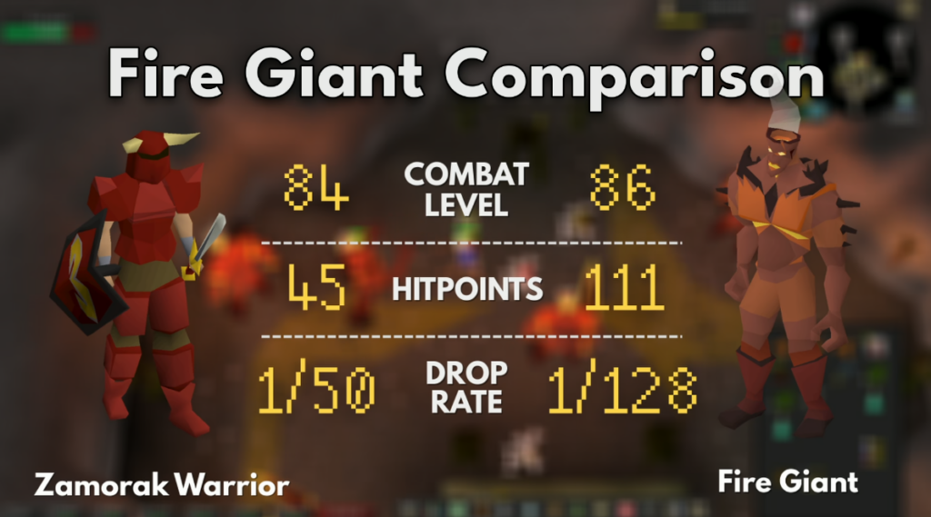 Fire giants are the method you’ll see recommended most often, but they’re actually a much slower option. Zamorak Warriors have a similar combat level but less than half the Hitpoints at just 45 HP. The drop rate is 1/50 compared to 1/128 for fire giants, and Zamorak Warriors can be safespotted — meaning you can kill them with zero supplies once you’re in position.