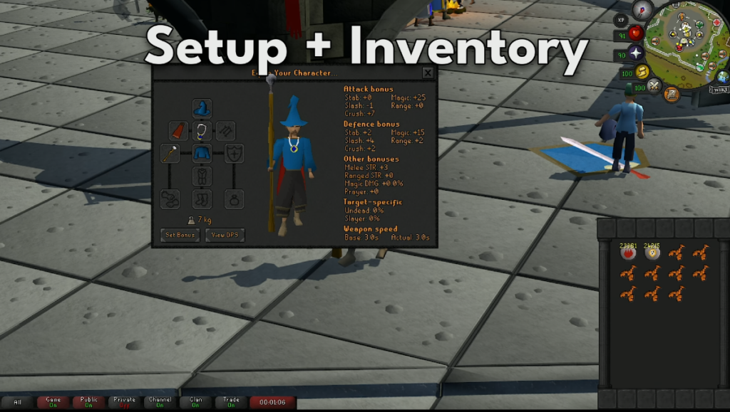 Since you’ll be safespotting, bring your best magic or ranged gear. Magic is the better option at lower levels because it generally hits harder against the Zamorak Warrior’s low defences.